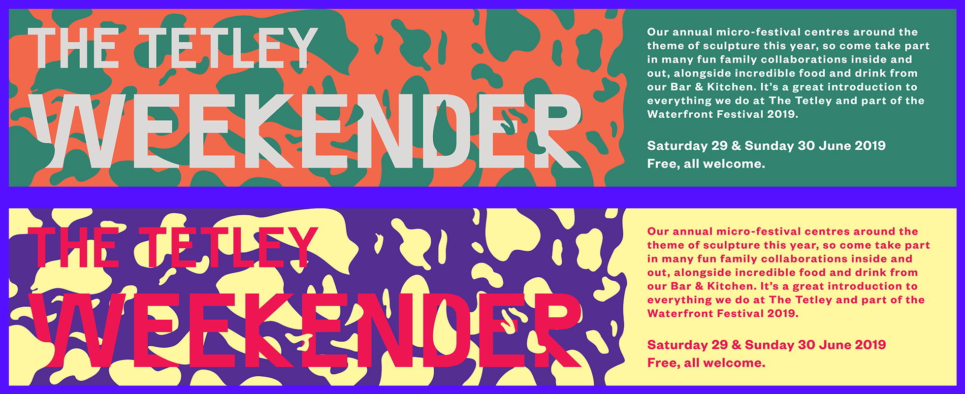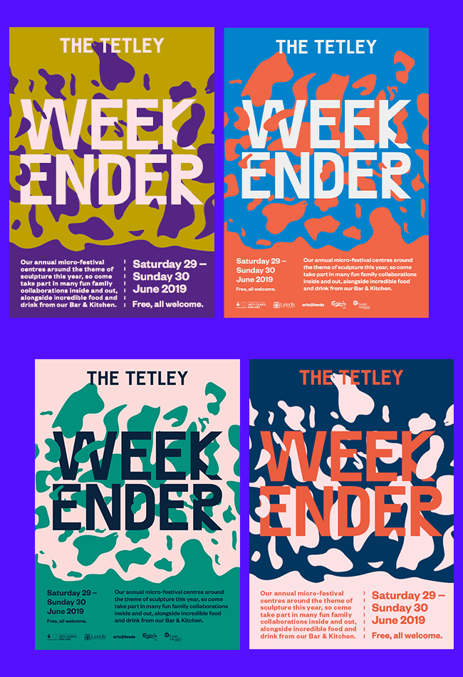 The Tetley Weekender is an annual arts festival for families, held in Leeds at the Iconic Tetley building. In 2019 my university class was tasked with creating the branding and marketing materials for the 2019 festival. This included an outdoor banner, posters, leaflets and digital assets.